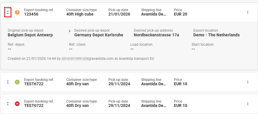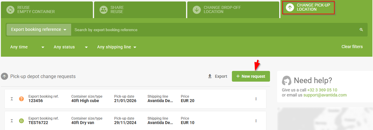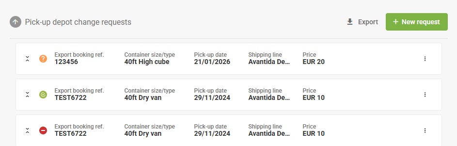 - You will be redirected to the overview page where your request will appear as 'pending' (orange). As soon as the shipping company has checked your request, the status will change to 'approved' (green) or 'declined' (red)